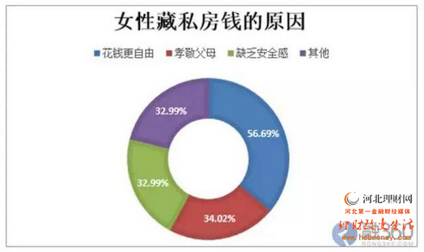 调查显示,超四成(43.14%)已婚人士藏私房钱,33.33%的男性存私房钱,女性存私房钱的比例明显高于男性,为51.74%。相比男性,女性藏私房钱的动机更多元化:除56.69%是为了自己花钱更自由外,还有34.02%是为了偷偷孝敬自己的父母,另有32.99%是因为对于婚姻关系缺乏安全感。