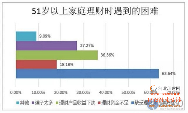对于中老年家庭而言,“缺乏理财知识和方式”是最大障碍。融360理财分析师认为,这是因为中老年家庭虽然积累了一定财富,却因为时代和年龄原因而对金融常识和理财知识缺乏概念。数据显示,银行理财产品占51岁及以上的家庭资产配置首位,80%的家庭购买银行理财产品,30%的家庭购买国债。