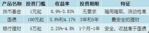 米米整理了三种低风险理财产品,按照投资门槛从低到高分别是货币基金、国债和银行理财。