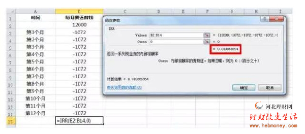 在excel中第1行输入12000元,这是你一共要分期的金额,然后在第2-14行输入-1072元,这是你往后每个月要还给银行的钱,相当于支出了,所以用“-”来表示,之后在「公式」中找到IRR,把每月要还的钱全都选中,即B2:B14,得出来的结果(下图红框框)就是实际的月利率,然后再乘上12,就得出了年利率,实际算出来是13.03%。