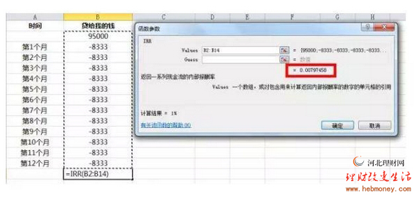 这样算来,实际贷给我的金额就是9.5万元,而我今后一年里每月要还的金额还是按照10万元计算的,也就是 10万/12个月=8333元,这种情况的实际利率用IRR计算,结果如下: