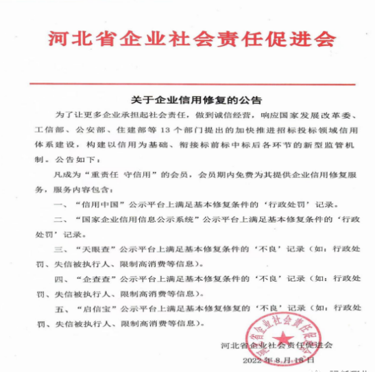 河北省企业社会责任促进会领导充分论证“企业信用修复”的市场价值和履行社会责任的意义,并发布《关于企业信用修复公告》。