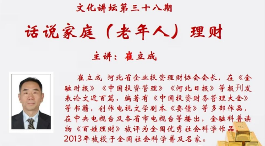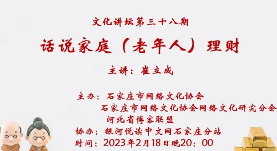 河北理财网报道(丹青)家庭如何做好财富规划,老年生活如何更加美好。 2023年2月18日20点,由石家庄市网络文化协会、石家庄市网络文化协会网络文化研究分会、河北博客联盟主办、银河悦读中文网石家庄文学分站协办的第三十八期文化讲坛在河北博客联盟微信群顺利开讲。本期讲坛特邀河北省企业投资理财协会会长崔立成先生主讲《话说家庭(老年人)理财》。