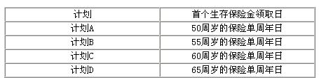 本主险合同有计划A、计划B、计划C及计划D四种计划可供您在投保时选择,并在保险单上载明。这四种计划对应的首个生存保险金领取日如下表所示: