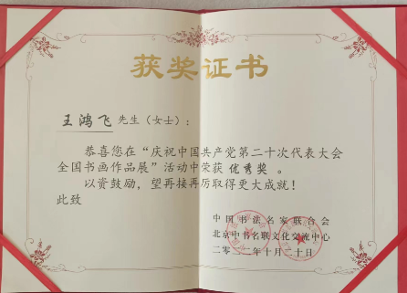 2022年10月20日全国书画作品展《北京中书名联文化交流中心》并获二等奖。