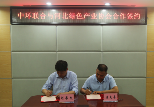 中环联合认证中心总经理刘尊文(左)与河北省绿色产业协会会长左克永签订战略合作协议