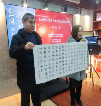 中国法制要案研究院主任张世龙也表示这样的学习活动应该常态化。毛主席十分具有前瞻性,在我们企业经营过程中也要有前瞻性,才能使企业基业长青。他本人一直在整理毛主席诗词,现场也带来了两幅书法作品《沁园春·雪》《满江红》,并且是用毛体书写向毛主席致敬。