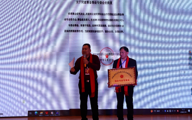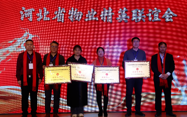 李志彦会长为新加入物业专委会的副会长单位(河北钉子电子科技有限公司、河北经技消防科技有限公司、河北汇成物业服务有限公司、浙江绿卓物业服务有限公司)颁发副会长单位牌匾。