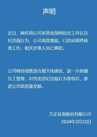 对于此事,2月22日,方正证券工作人员回应称,公司并已经启动内部核实程序,将尽快查明事实,并根据公司政策采取适当措施。(来源:新行情公众号)