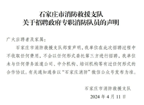 京津冀在线网综合(谢颖)京津冀在线网从石家庄消防公众号获悉,为进一步提升全市综合应急救援能力,履行防范化解重大安全风险、应对处置各类灾害事故的职责使命。石家庄市消防救援支队现面向社会公开招聘政府专职消防队员209人,工作地点为石家庄各县(市)区消防救援站。具体招聘公告如下: