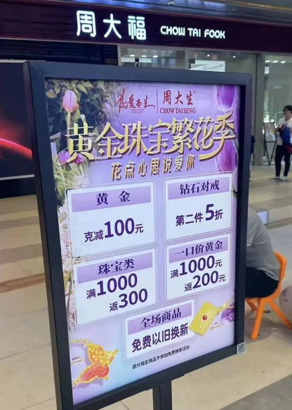 据中国证券报走访,周大生门店销售人员称:“假期每克优惠100元,优惠后599元/克,工本费另算。假期期间,除了门店活动,商场针对购金也有优惠活动。”