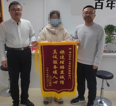 河北理财网综合(薛云近日,H女士的家属将一面印有“快速理赔显诚信 真诚服务暖人”字样的锦旗送到了百年人寿廊坊中支柜面理赔人员的手中,对公司高效、专业、贴心的理赔服务表达了诚挚的感谢。