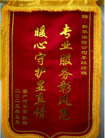 何女士对新华保险全流程服务赞不绝口:"从联系住院到完成理赔,每个环节都感受到专业与温度,真正解决了我们的燃眉之急。"为表谢意,她专程向秦皇岛中支赠送锦旗,鲜红锦旗上的烫金文字,成为客户对新华服务最直观的认可。