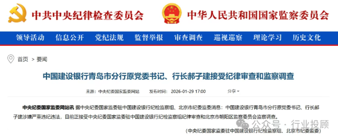 河北理财网综合:2026年1月29日,中央纪委国家监委驻中国建设银行纪检监察组、北京市纪委监委联合发布消息,中国建设银行青岛市分行原党委书记、行长郝子建,因涉嫌严重违纪违法,正式接受纪律审查和监察调查。