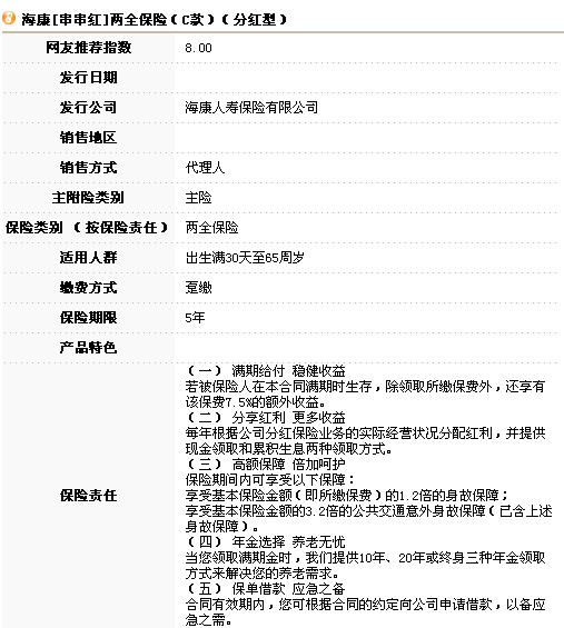 海康[串串红]两全保险(C款)(分红型)--产品超市-保险-河北理财网—河北权威财经门户